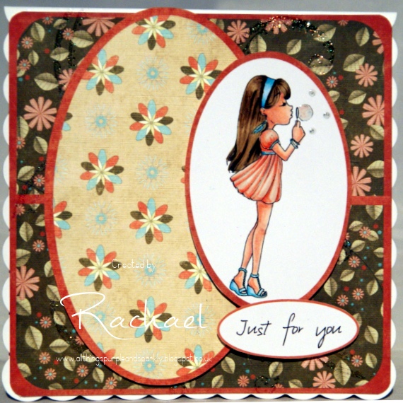 As this was about bubbles, i though of circles, however they ended up as vals. The backing paper are from a Kay Miller digi kit called Cranberry fusion, which i also used to make the insert The image was coloured with promarkers and spectrum noir pencils.